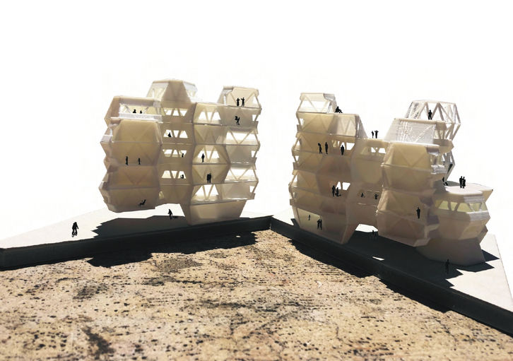 Els hexàgons es troben al barri del Poblenou, adjacent al cementiri del barri. Aquest projecte va començar amb la voluntat de trobar-se mirant al seu voltant. Les fàbriques amb les cobertes a dues aigües de la zona van ser el punt de partida. La idea de buscar la geometria des del lloc a partir de la forma triangular de la coberta va esdevenir una autèntica marató cap a l'experimentació geomètrica del projecte. Tant és així, que tot el projecte gira entorn la peça, com a unitat. Aquesta peça s'entén principalment des de la volumetria doncs tant en secció com en planta té una forma hexagonal irregular. L'oportunitat de portar aquesta unitat al seu màxim ens va permetre dialogar amb l'entorn generant els espais urbans que volíem. Per exemple, passatges que desembocaven a places o portes que donaven la benvinguda al barri, sempre per mitjà de l'acumulació precisa d'aquesta peça. D'altra banda, aquest projecte em va ensenyar a experimentar amb els espais comuns més privats o més oberts i poder classificar el tipus d'ús per a cada zona. L'hexàgon en si, ens va permetre imaginar un tipus d'espai molt diferent gràcies als angles diversos que es generaven i per tant descobrir els diferents estils de vida que podia proporcionar aquesta peça segons l'agrupació que es feia d'aquesta. La prefabricació del mòdul també va ser una premissa important que vaig acabar desenvolupant precisa i detalladament l'any següent.